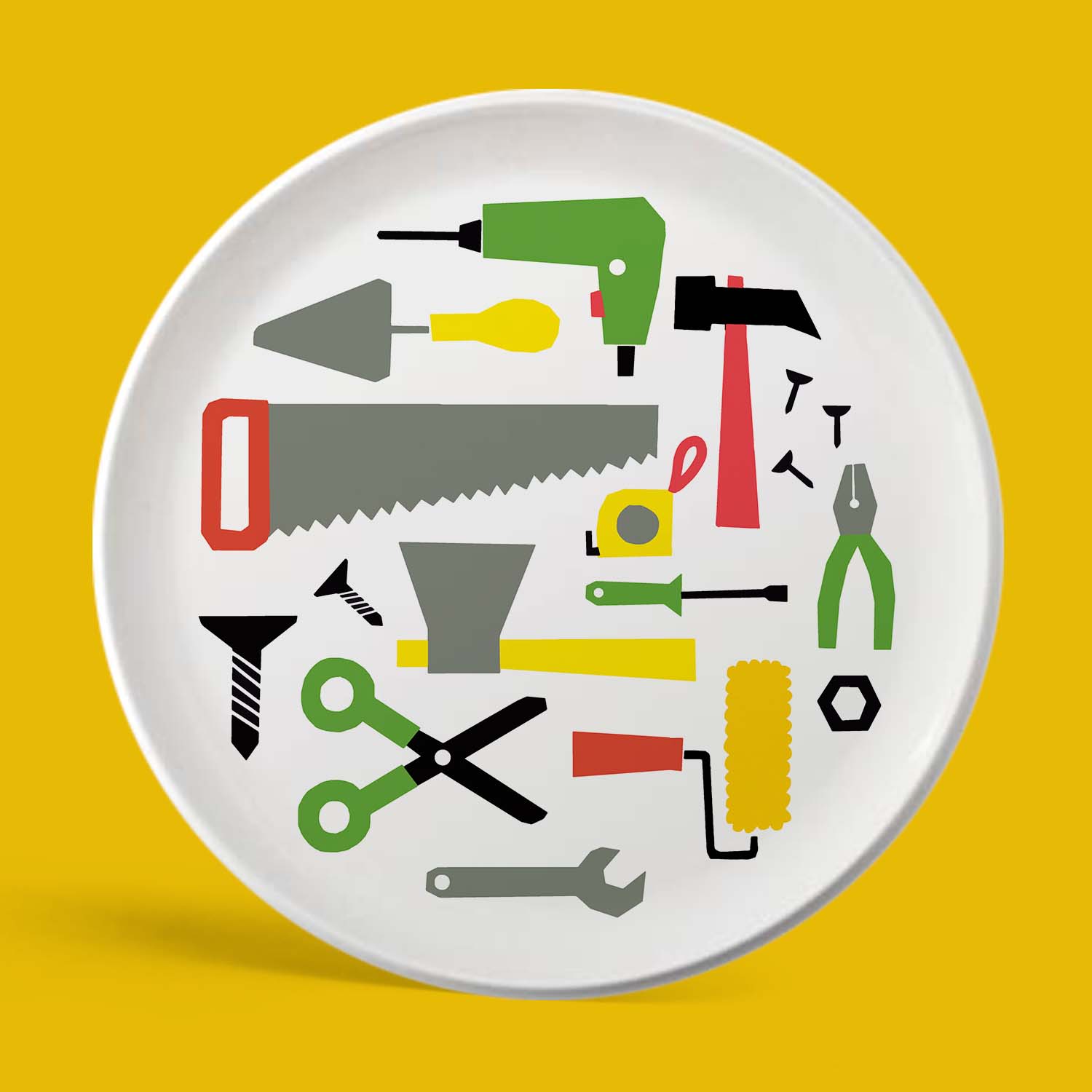 Hva ser du her? Hva bruker vi hammeren til? Og sagen … og drillen … . Har du brukt noe verktøy? Fortell. Hvilke verktøy bruker snekkeren? Mureren? Maleren? Har dere verktøy hjemme? Tenk hvis jeg traff fingeren med hammeren! Hva skjer da?